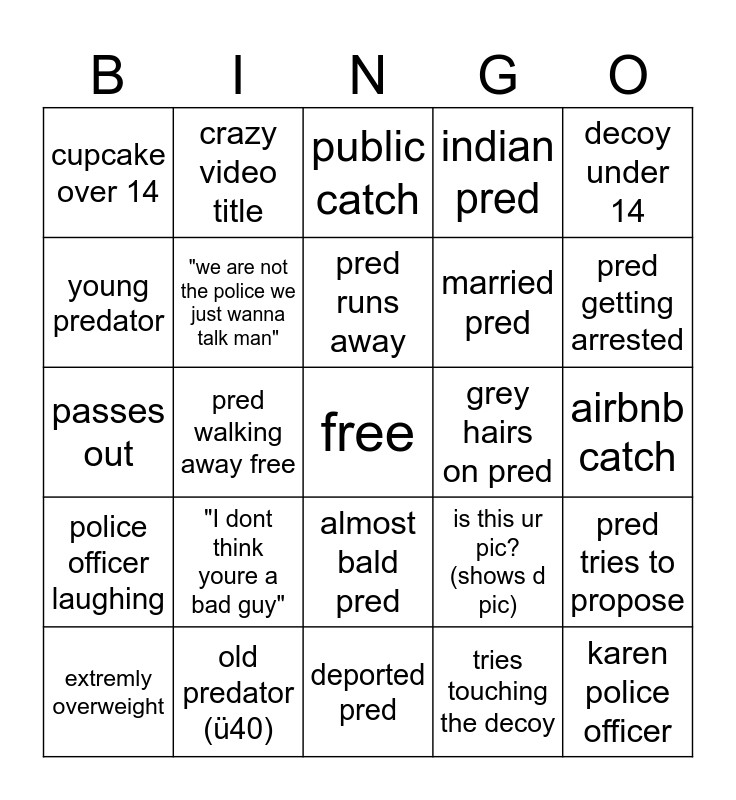This bingo card has a free space and 24 words: "I dont think youre a bad guy", old predator (ü40), pred runs away, extremly overweight, decoy under 14, cupcake over 14, young predator, crazy video title, grey hairs on pred, almost bald pred, married pred, passes out, is this ur pic? (shows d pic), pred tries to propose, "we are not the police we just wanna talk man", tries touching the decoy, airbnb catch, public catch, pred getting arrested, pred walking away free, karen police officer, police officer laughing, indian pred and deported pred.