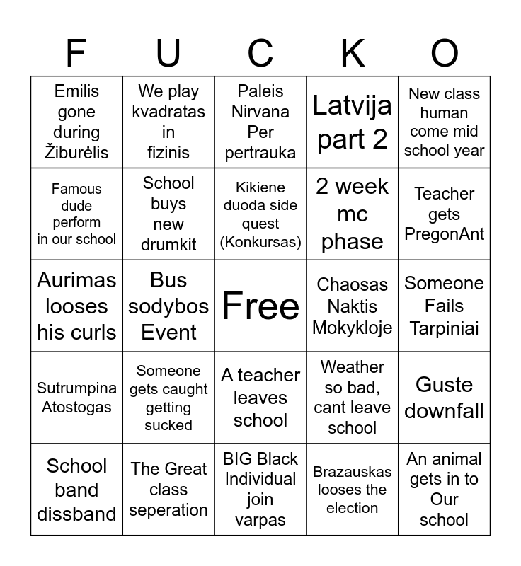 This bingo card has a free space and 24 words: Someone gets caught getting sucked, The Great class seperation, Kikiene duoda side quest (Konkursas), School band dissband, New class human come mid school year, Emilis gone during Žiburėlis, Famous dude perform in our school, We play kvadratas in fizinis, Chaosas Naktis Mokykloje, A teacher leaves school, 2 week mc phase, Aurimas looses his curls, Weather so bad, cant leave school, Guste downfall, School buys new drumkit, Brazauskas looses the election, Someone Fails Tarpiniai, Paleis Nirvana Per pertrauka, Teacher gets PregonAnt, Bus sodybos Event, An animal gets in to Our school, Sutrumpina Atostogas, Latvija part 2 and BIG Black Individual join varpas.
