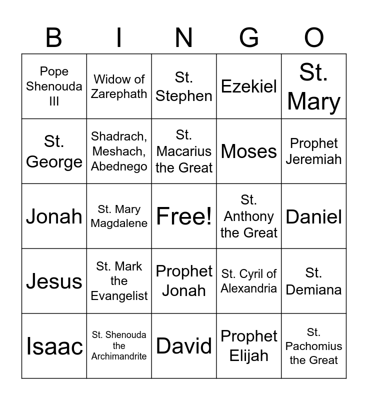 This bingo card has a free space and 24 words: St. Mark the Evangelist, St. Shenouda the Archimandrite, St. Macarius the Great, Isaac, St. Mary, Pope Shenouda III, St. George, Widow of Zarephath, St. Anthony the Great, Prophet Jonah, Moses, Jonah, St. Cyril of Alexandria, St. Demiana, Shadrach, Meshach, Abednego, Prophet Elijah, Daniel, St. Stephen, Prophet Jeremiah, St. Mary Magdalene, St. Pachomius the Great, Jesus, Ezekiel and David.