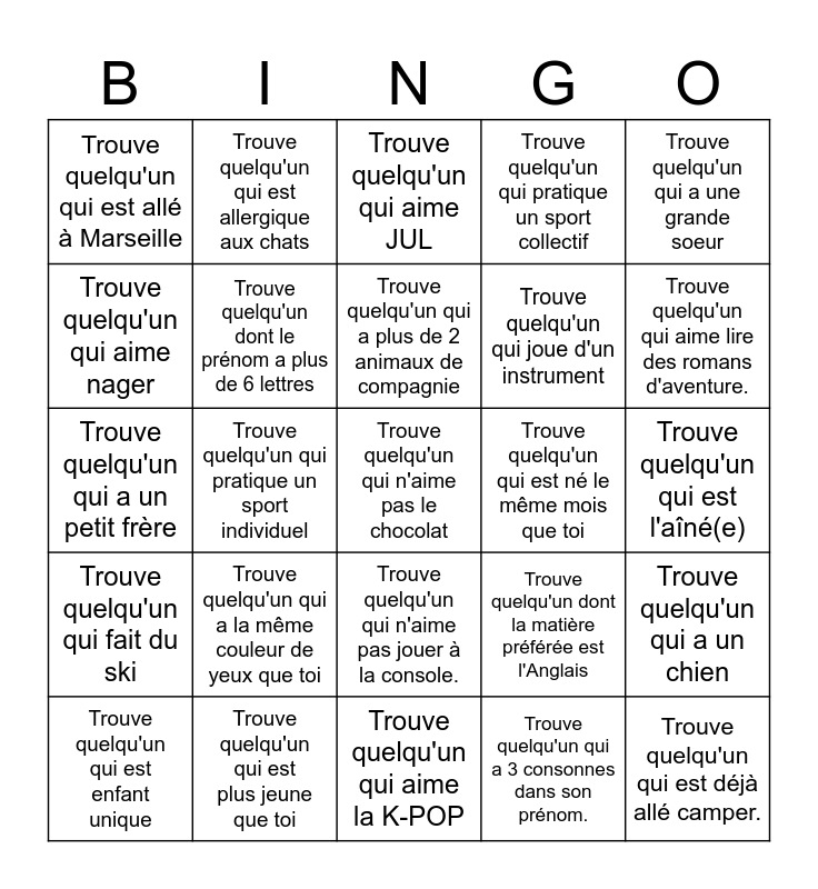 This bingo card has 25 words: Trouve quelqu'un qui a la même couleur de yeux que toi, Trouve quelqu'un qui aime la K-POP, Trouve quelqu'un qui a plus de 2 animaux de compagnie, Trouve quelqu'un qui est enfant unique, Trouve quelqu'un qui a une grande soeur, Trouve quelqu'un qui est allé à Marseille, Trouve quelqu'un qui aime nager, Trouve quelqu'un qui est allergique aux chats, Trouve quelqu'un qui est né le même mois que toi, Trouve quelqu'un qui n'aime pas jouer à la console., Trouve quelqu'un qui joue d'un instrument, Trouve quelqu'un qui a un petit frère, Trouve quelqu'un dont la matière préférée est l'Anglais, Trouve quelqu'un qui a un chien, Trouve quelqu'un dont le prénom a plus de 6 lettres, Trouve quelqu'un qui est déjà allé camper., Trouve quelqu'un qui est l'aîné(e), Trouve quelqu'un qui aime JUL, Trouve quelqu'un qui aime lire des romans d'aventure., Trouve quelqu'un qui pratique un sport individuel, Trouve quelqu'un qui n'aime pas le chocolat, Trouve quelqu'un qui est plus jeune que toi, Trouve quelqu'un qui fait du ski, Trouve quelqu'un qui pratique un sport collectif and Trouve quelqu'un qui a 3 consonnes dans son prénom..