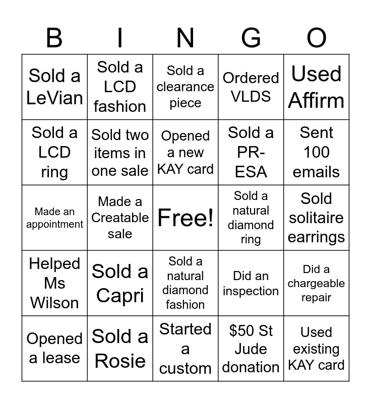 This bingo card has a free space and 24 words: Sold a Capri, Sold a Rosie, Opened a new KAY card, Opened a lease, Used Affirm, Sold a LeVian, Sold a LCD ring, Sold a LCD fashion, Sold a natural diamond ring, Sold a natural diamond fashion, Sold a PR-ESA, Made an appointment, Did an inspection, Did a chargeable repair, Sold two items in one sale, $50 St Jude donation, Sold solitaire earrings, Sold a clearance piece, Sent 100 emails, Made a Creatable sale, Used existing KAY card, Helped Ms Wilson, Ordered VLDS and Started a custom.