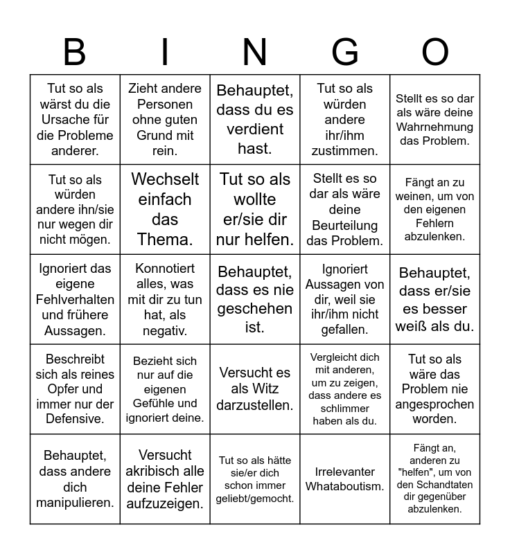 This bingo card has a free space and 24 words: Bezieht sich nur auf die eigenen Gefühle und ignoriert deine., Versucht akribisch alle deine Fehler aufzuzeigen., Tut so als wollte er/sie dir nur helfen., Behauptet, dass andere dich manipulieren., Stellt es so dar als wäre deine Wahrnehmung das Problem., Tut so als wärst du die Ursache für die Probleme anderer., Tut so als würden andere ihn/sie nur wegen dir nicht mögen., Zieht andere Personen ohne guten Grund mit rein., Ignoriert Aussagen von dir, weil sie ihr/ihm nicht gefallen., Versucht es als Witz darzustellen., Stellt es so dar als wäre deine Beurteilung das Problem., Ignoriert das eigene Fehlverhalten und frühere Aussagen., Vergleicht dich mit anderen, um zu zeigen, dass andere es schlimmer haben als du., Tut so als wäre das Problem nie angesprochen worden., Wechselt einfach das Thema., Irrelevanter Whataboutism., Behauptet, dass er/sie es besser weiß als du., Behauptet, dass du es verdient hast., Fängt an zu weinen, um von den eigenen Fehlern abzulenken., Konnotiert alles, was mit dir zu tun hat, als negativ., Fängt an, anderen zu "helfen", um von den Schandtaten dir gegenüber abzulenken., Beschreibt sich als reines Opfer und immer nur der Defensive., Tut so als würden andere ihr/ihm zustimmen. and Tut so als hätte sie/er dich schon immer geliebt/gemocht..
