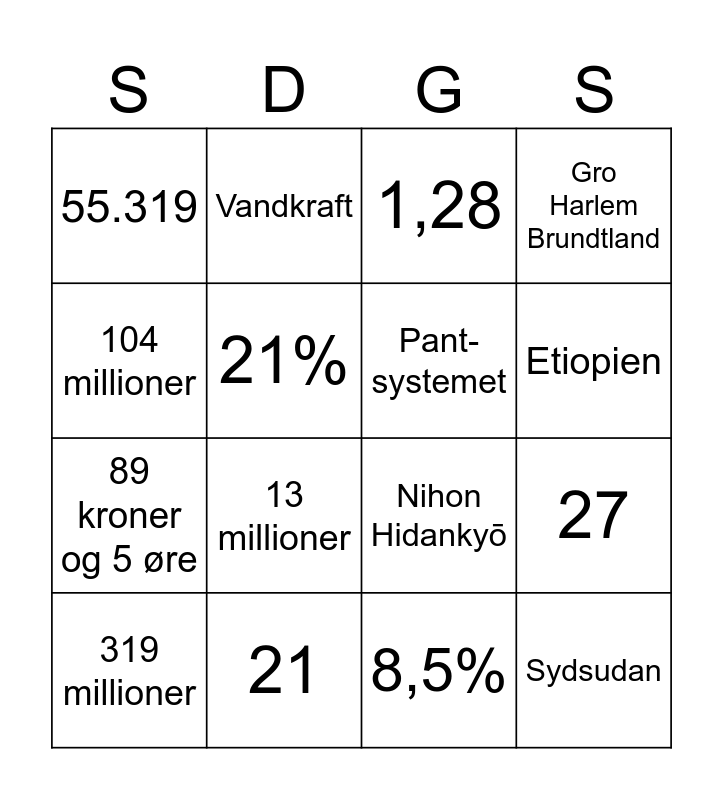 This bingo card has 48 words: Kina, 319 millioner, Trafik, 754 millioner, Skotland, 0,76%, Vandkraft, 6,6 millioner, 21%, 1248, Pant-systemet, Gro Harlem Brundtland, 25%, 69%, Finland, 4, Etiopien, 21, 5 millioner, 104 millioner, 27, 67%, 55.319, 89 kroner og 5 øre, 2021, 13 millioner, Nokia, 25, 344, Sydsudan, Malala Yousafzai, Gravide kvinder, Niger, Mænd, Rwanda, 54, 60, 8,5%, Slovenien, 64, 70%, Reduce, Reuse, Recycle, 1,28, The Great Pacific Garbage Patch, Nihon Hidankyō, Conference of Parties, Akvakultur and DR Congo.