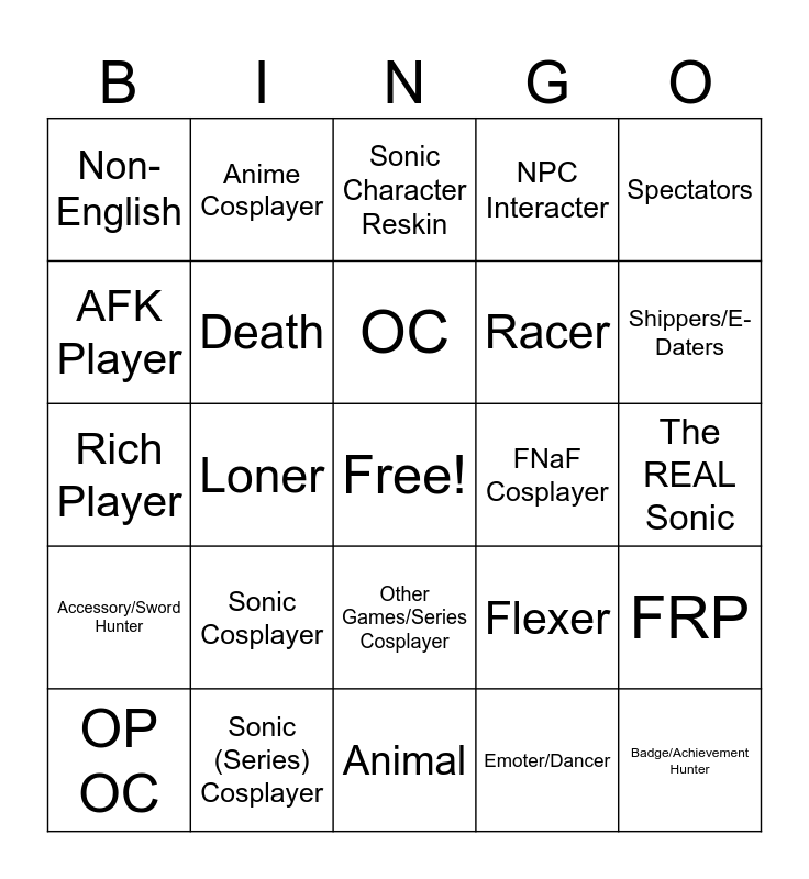 This bingo card has a free space and 24 words: Sonic Cosplayer, Sonic (Series) Cosplayer, OC, OP OC, Spectators, Non-English, AFK Player, Anime Cosplayer, FNaF Cosplayer, Other Games/Series Cosplayer, Racer, Rich Player, Flexer, FRP, Death, Emoter/Dancer, The REAL Sonic, Sonic Character Reskin, Shippers/E-Daters, Loner, Badge/Achievement Hunter, Accessory/Sword Hunter, NPC Interacter and Animal.
