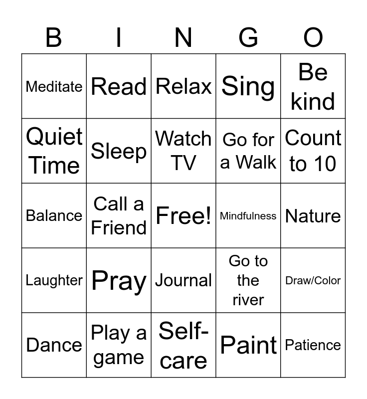 This bingo card has a free space and 24 words: Pray, Play a game, Watch TV, Dance, Be kind, Meditate, Quiet Time, Read, Mindfulness, Journal, Go for a Walk, Balance, Go to the river, Draw/Color, Sleep, Paint, Nature, Relax, Count to 10, Call a Friend, Patience, Laughter, Sing and Self-care.