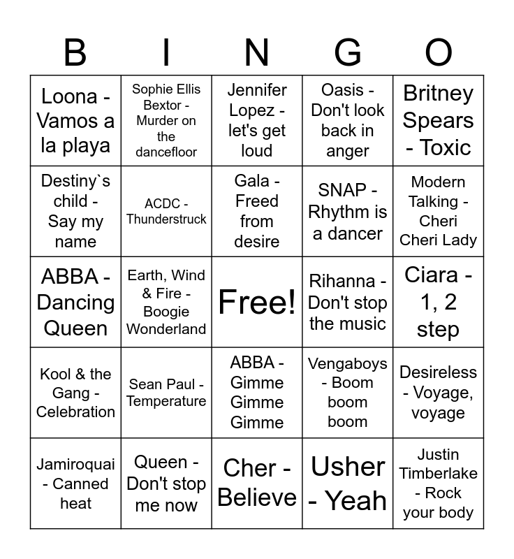 This bingo card has a free space and 41 words: No Angels - Daylight, ABBA - Dancing Queen, Neil Young - Heart of Gold, ACDC - Thunderstruck, Queen - Don't stop me now, ABBA - Gimme Gimme Gimme, Gala - Freed from desire, a-ha - Take on me, Britney Spears - Toxic, Kool & the Gang - Celebration, Earth, Wind & Fire - Boogie Wonderland, Oasis - Don't look back in anger, Justin Timberlake - Rock your body, Ciara - 1, 2 step, Rihanna - Don't stop the music, Sean Paul - Temperature, Outkast - Ms Jackson, Loona - Vamos a la playa, Ryan Gosling - I'm just Ken, Jennifer Lopez - let's get loud, Desireless - Voyage, voyage, Geri Halliwell - It's raining man, Cher - Believe, SNAP - Rhythm is a dancer, Bon Jovi - Livin on a prayer, Natasha Bedingfield - Unwritten, Usher - Yeah, Bananarama - Venus, Modern Talking - Cheri Cheri Lady, Black Eyed Peas - Where is the love, Culcha Candela - Hamma, Sophie Ellis Bextor - Murder on the dancefloor, Jamiroquai - Canned heat, Carly Ray Jepsen - Call me maybe, Vengaboys - Boom boom boom, Destiny`s child - Say my name, Snoop Dogg - Drop it like it's hot, Toto - Hold the line, Bee Gees - Stayin alive, Eiffel 67 - Blue and Madonna - Like a prayer.