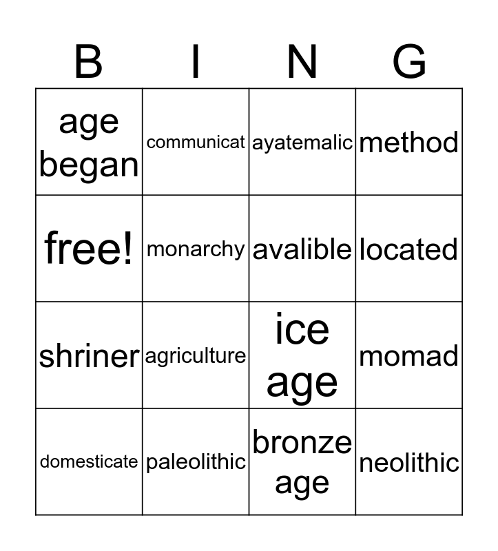 This bingo card has a free space and 15 words: domesticate, neolithic, ayatemalic, age began, located, free!, agriculture, bronze age, monarchy, shriner, momad, method, avalible, communicat and paleolithic.