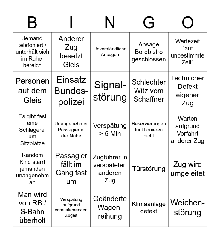 This bingo card has a free space and 24 words: Passagier fällt im Gang fast um, Verspätung aufgrund vorausfahrenden Zuges, Signal-störung, Man wird von RB / S-Bahn überholt, Wartezeit "auf unbestimmte Zeit", Jemand telefoniert / unterhält sich im Ruhe-bereich, Personen auf dem Gleis, Anderer Zug besetzt Gleis, Reservierungen funktionieren nicht, Zugführer in verspäteten anderen Zug, Schlechter Witz vom Schaffner, Es gibt fast eine Schlägerei um Sitzplätze, Türstörung, Zug wird umgeleitet, Einsatz Bundes-polizei, Klimaanlage defekt, Warten aufgrund Vorfahrt anderer Zug, Unverständliche Ansagen, Technicher Defekt eigener Zug, Unangenehmer Passagier in der Nähe, Weichen-störung, Random Kind starrt jemanden unangenehm an, Ansage Bordbistro geschlossen and Geänderte Wagen-reihung.