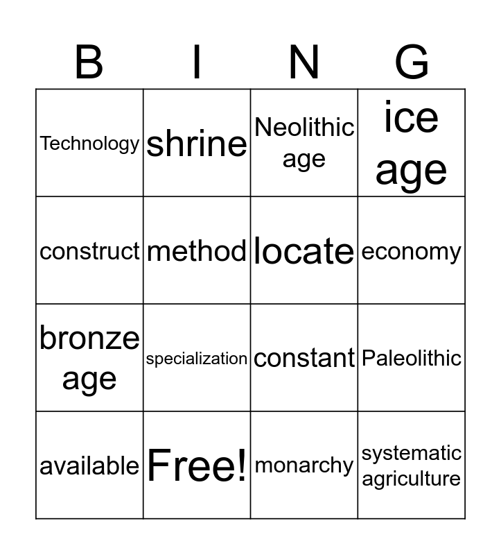 This bingo card has 16 words: Free!, Paleolithic, Neolithic age, Technology, bronze age, shrine, constant, monarchy, construct, method, available, ice age, specialization, economy, locate and systematic agriculture.