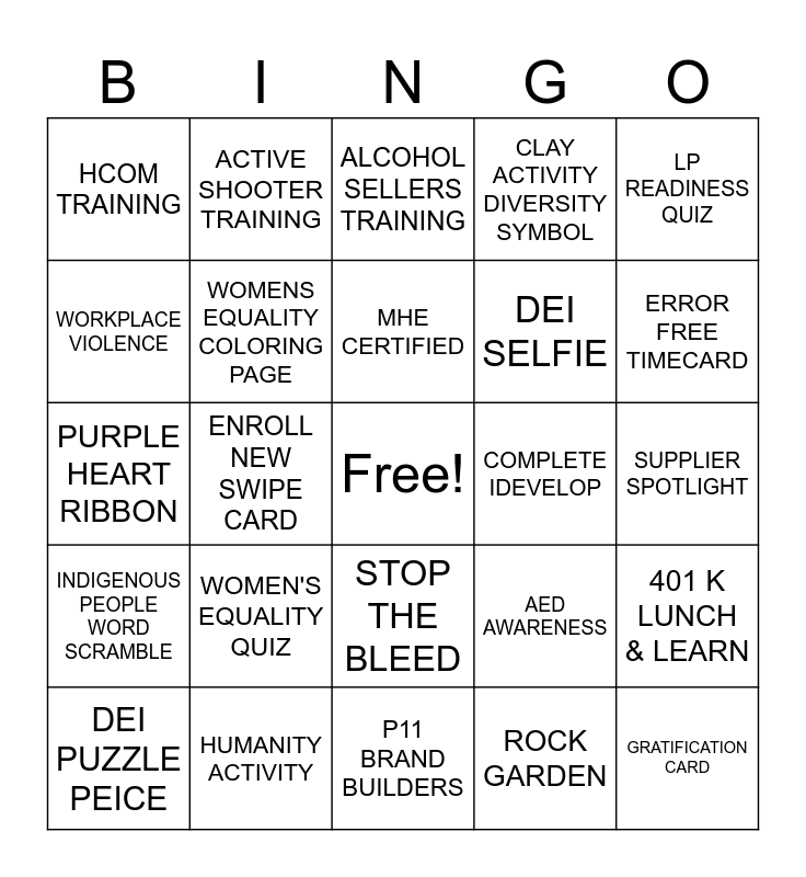 This bingo card has a free space and 24 words: WOMEN'S EQUALITY QUIZ, HUMANITY ACTIVITY, MHE CERTIFIED, DEI PUZZLE PEICE, LP READINESS QUIZ, HCOM TRAINING, WORKPLACE VIOLENCE, ACTIVE SHOOTER TRAINING, COMPLETE IDEVELOP, STOP THE BLEED, DEI SELFIE, PURPLE HEART RIBBON, AED AWARENESS, 401 K LUNCH & LEARN, WOMENS EQUALITY COLORING PAGE, ROCK GARDEN, SUPPLIER SPOTLIGHT, ALCOHOL SELLERS TRAINING, ERROR FREE TIMECARD, ENROLL NEW SWIPE CARD, GRATIFICATION CARD, INDIGENOUS PEOPLE WORD SCRAMBLE, CLAY ACTIVITY DIVERSITY SYMBOL and P11 BRAND BUILDERS.