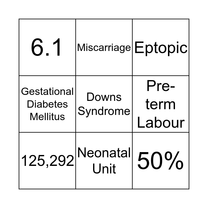 This bingo card has a free space and 14 words: Geriatric mother, Advanced maternal age, 125,292, Miscarriage, Gestational Diabetes Mellitus, 50%, Caesarean Section, myometrium function deteriorates with age, Neonatal Unit, 6.1, Low Birth Weight, Pre-term Labour, Eptopic and Pregnancy.