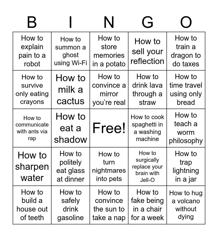 This bingo card has a free space and 24 words: How to politely eat glass at dinner, How to safely drink gasoline, How to convince a mirror you’re real, How to build a house out of teeth, How to train a dragon to do taxes, How to explain pain to a robot, How to survive only eating crayons, How to summon a ghost using Wi-Fi, How to cook spaghetti in a washing machine, How to turn nightmares into pets, How to drink lava through a straw, How to communicate with ants via rap, How to surgically replace your brain with Jell-O, How to trap lightning in a jar, How to milk a cactus, How to fake being in a chair for a week, How to teach a worm philosophy, How to store memories in a potato, How to time travel using only bread, How to eat a shadow, How to hug a volcano without dying, How to sharpen water, How to sell your reflection and How to convince the sun to take a nap.