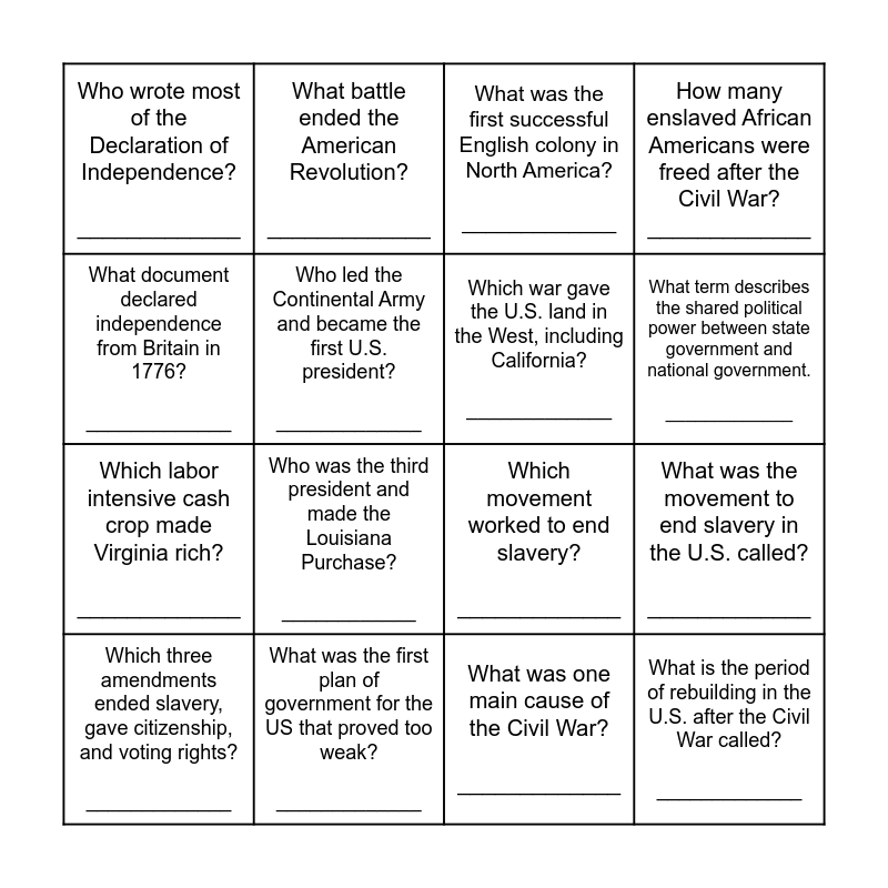 This bingo card has 24 words: Who and is credited with “discovering” America in 1492? _____________, Which group started Plymouth for religious freedom? _____________, What term describes the shared political power between state government and national government. _____________, Name the forced journey of enslaved Africans across the Atlantic Ocean. _____________, What document declared independence from Britain in 1776? _____________, Who wrote most of the Declaration of Independence? _____________, Who led the Continental Army and became the first U.S. president? _____________, What battle ended the American Revolution? _____________, What was the first plan of government for the US that proved too weak? _____________, What was one main cause of the Civil War? _____________, Which labor intensive cash crop made Virginia rich? _____________, Which movement worked to end slavery? _____________, What 1820 law tried to maintain balance between free and slave states? _____________, What idea said the U.S. had a God-given right to expand west? _____________, Which war gave the U.S. land in the West, including California? _____________, Which president's 1860 was election caused Southern secession? _____________, What was one main cause of the Civil War? _____________, What was the first successful English colony in North America? _____________, Who was the third president and made the Louisiana Purchase? ____________, What was the movement to end slavery in the U.S. called? _____________, Which three amendments ended slavery, gave citizenship, and voting rights? _____________, What is the period of rebuilding in the U.S. after the Civil War called? _____________, How many enslaved African Americans were freed after the Civil War? _____________ and In the Colonial period how many regions were there in the US? _____________.