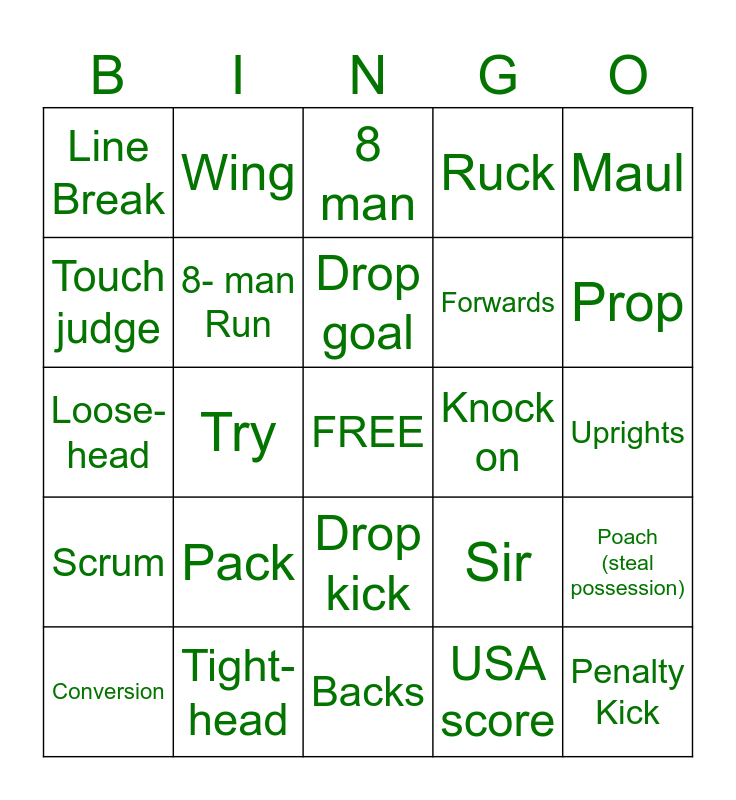 This bingo card has a free space and 39 words: Wing, Rugby, Rugger, 8- man Run, Conversion, Drop kick, Drop goal, Lineout, Maul, Scrum, Try, Ruck, Penalty Kick, Uprights, Knock on, Pack, Pass, Line Break, Penalty, Sir, Touch judge, Backs, Forwards, Prop, Lock, Flanker, Hooker, Scrum half, Full Back, Wing, Centre, Fly half, 8 man, Tight-head, USA score, Samoa score, Poach (steal possession), Loose-head and Blocked Kick.