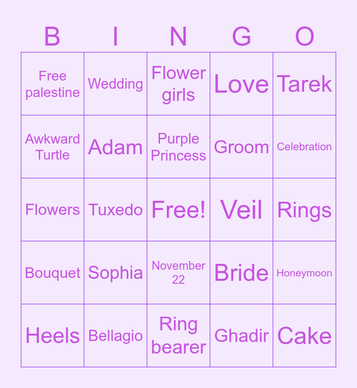 This bingo card has a free space and 26 words: November 22, Ghadir, Purple Princess, Bellagio, Tarek, Free palestine, Awkward Turtle, Wedding, Rings, Bride, Groom, Flowers, Honeymoon, Heels, Tuxedo, Wedding Dress, Love, Bouquet, Flower girls, Cake, Celebration, Ring bearer, Veil, Sophia, Adam and Jenna.