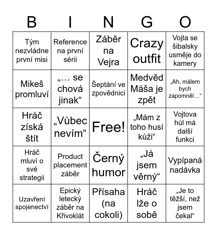 This bingo card has a free space and 24 words: Product placement záběr, Epický letecký záběr na Křivoklát, Šeptání ve zpovědnici, Uzavření spojenectví, Vojta se šibalsky usměje do kamery, Tým nezvládne první misi, Mikeš promluví, Reference na první sérii, „Mám z toho husí kůži“, Černý humor, Medvěd Máša je zpět, Hráč získá štít, „Já jsem věrný“, Vypípaná nadávka, „… se chová jinak“, Hráč lže o sobě, Vojtova hůl má další funkci, Záběr na Vejra, „Ah, málem bych zapomněl…“, „Vůbec nevím“, „Je to těžší, než jsem čekal“, Hráč mluví o své strategii, Crazy outfit and Přísaha (na cokoli).