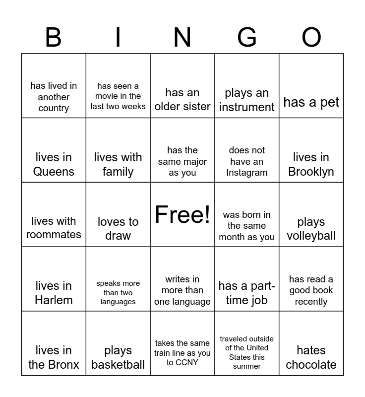 This bingo card has a free space and 24 words: speaks more than two languages, plays basketball, has the same major as you, lives in the Bronx, has a pet, has lived in another country, lives in Queens, has seen a movie in the last two weeks, was born in the same month as you, writes in more than one language, does not have an Instagram, lives with roommates, has a part-time job, has read a good book recently, lives with family, traveled outside of the United States this summer, plays volleyball, has an older sister, lives in Brooklyn, loves to draw, hates chocolate, lives in Harlem, plays an instrument and takes the same train line as you to CCNY.