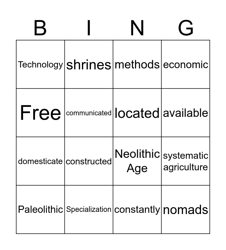 This bingo card has a free space and 15 words: Paleolithic, nomads, methods, Technology, available, Free, constructed, constantly, communicated, domesticate, systematic agriculture, economic, located, shrines and Specialization.
