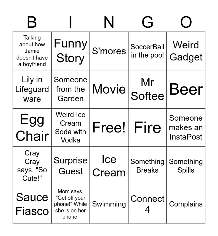 This bingo card has a free space and 25 words: Surprise Guest, Swimming, Movie, Sauce Fiasco, Weird Gadget, Talking about how Jamie doesn't have a boyfriend, Lily in Lifeguard ware, Funny Story, Fire, Ice Cream, Mr Softee, Egg Chair, Something Breaks, Something Spills, Someone from the Garden, Someone calls BB, Someone makes an InstaPost, S'mores, Beer, Weird Ice Cream Soda with Vodka, Complains, Mom says, "Get off your phone!" While she is on her phone., Cray Cray says, "So Cute!", SoccerBall in the pool and Connect 4.