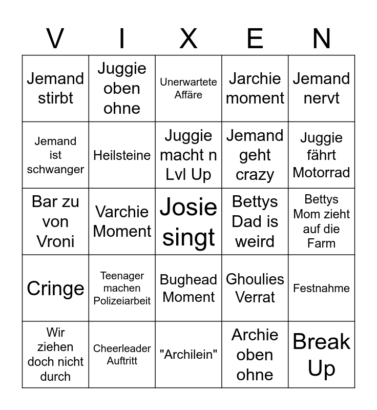 This bingo card has 30 words: Cheerleader Auftritt, Jellybean da, Varchie Moment, Shalala hat fast nix an, Jemand stirbt, Unerwartete Affäre, Heilsteine, Bughead Moment, Bettys Dad is weird, "Archilein", Bettys Mom zieht auf die Farm, Josie singt, Archie oben ohne, Break Up, Juggie fährt Motorrad, Treffen im Pops, Ghoulies Verrat, Cringe, Teenager machen Polizeiarbeit, Jemand nervt, Bar zu von Vroni, FP Hot, Juggie oben ohne, Jemand geht crazy, Jemand ist schwanger, Jarchie moment, Festnahme, Wir ziehen doch nicht durch, Juggie macht n Lvl Up and Schwestern Comeback.