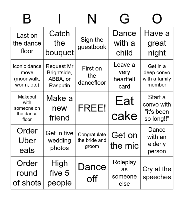 This bingo card has a free space and 24 words: Order round of shots, Get in five wedding photos, First on the dancefloor, Roleplay as someone else, Have a great night, Last on the dance floor, Catch the bouquet, Sign the guestbook, Eat cake, Start a convo with "it's been so long!!", Makeout with someone on the dance floor, Request Mr Brightside, ABBA, or Rasputin, Get on the mic, Dance with an elderly person, Iconic dance move (moonwalk, worm, etc), High five 5 people, Dance off, Dance with a child, Get in a deep convo with a family member, Order Uber eats, Make a new friend, Congratulate the bride and groom, Leave a very heartfelt card and Cry at the speeches.