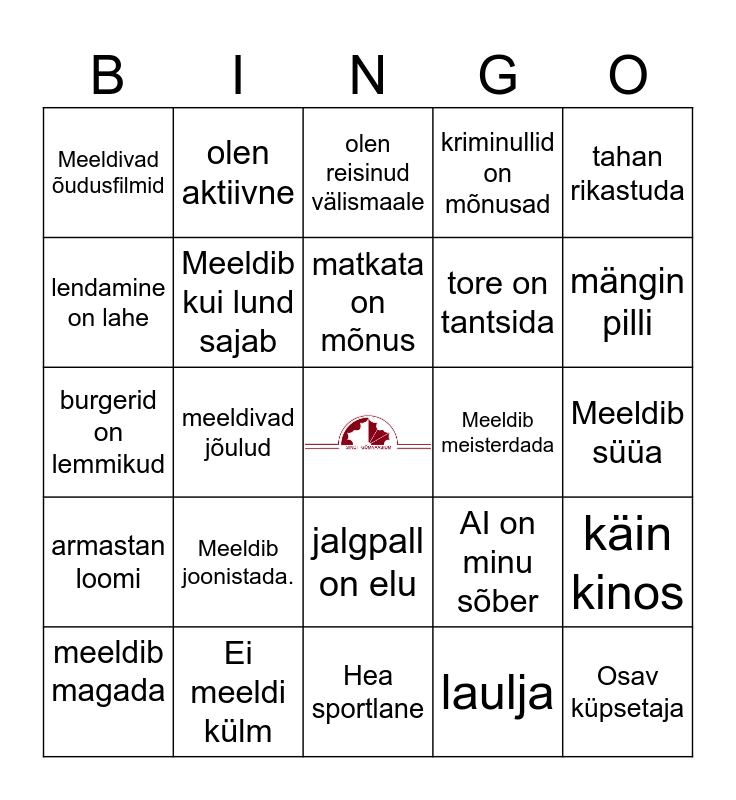 This bingo card has a free space and 29 words: meeldib magada, meeldib lugeda, meeldivad jõulud, kannab prille, Meeldivad õudusfilmid, olen reisinud välismaale, Meeldib kui lund sajab, Meeldib joonistada., Meeldib meisterdada, Ei meeldi külm, Meeldib süüa, Osav küpsetaja, Hea sportlane, laulja, mängin pilli, sõidan rattaga, jalgpall on elu, armastan loomi, tahan rikastuda, burgerid on lemmikud, AI on minu sõber, armastan matemaatikat, tore on tantsida, lendamine on lahe, kriminullid on mõnusad, olen aktiivne, käin kinos, matkata on mõnus and pallimängud on lemmikud.