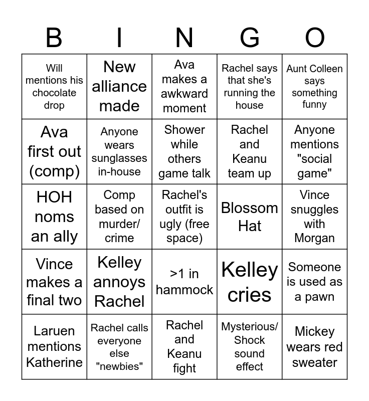 This bingo card has a free space and 27 words: Kelley cries, Vince fake tears, Rachel and Keanu team up, Rachel and Keanu fight, Ava first out (comp), Ava makes a awkward moment, New alliance made, Vince makes a final two, Blossom Hat, Someone is used as a pawn, HOH noms an ally, Rachel says that she's running the house, Laruen mentions Katherine, Rachel calls everyone else "newbies", Anyone mentions "social game", Anyone mentions "Jury", Anyone wears sunglasses in-house, Shower while others game talk, Kelley annoys Rachel, Will mentions his chocolate drop, Vince snuggles with Morgan, Mysterious/ Shock sound effect, Comp based on murder/ crime, Mickey wears red sweater, >1 in hammock, Aunt Colleen says something funny and Timmy has no clue.