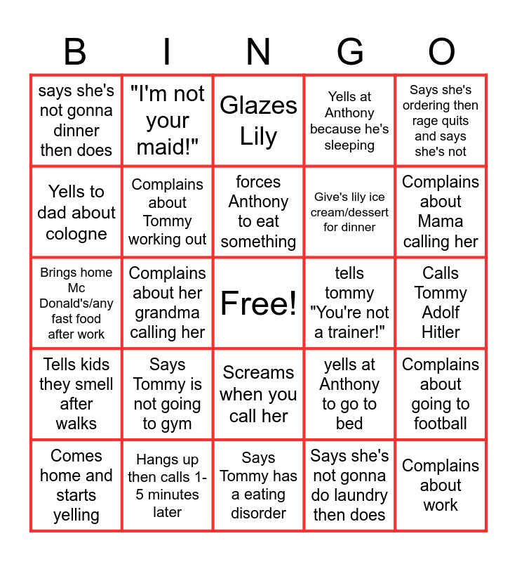 This bingo card has a free space and 24 words: Says Tommy is not going to gym, Hangs up then calls 1- 5 minutes later, forces Anthony to eat something, Comes home and starts yelling, Says she's ordering then rage quits and says she's not, says she's not gonna dinner then does, Yells to dad about cologne, "I'm not your maid!", tells tommy "You're not a trainer!", Screams when you call her, Give's lily ice cream/dessert for dinner, Brings home Mc Donald's/any fast food after work, yells at Anthony to go to bed, Complains about going to football, Complains about Tommy working out, Says she's not gonna do laundry then does, Calls Tommy Adolf Hitler, Glazes Lily, Complains about Mama calling her, Complains about her grandma calling her, Complains about work, Tells kids they smell after walks, Yells at Anthony because he's sleeping and Says Tommy has a eating disorder.