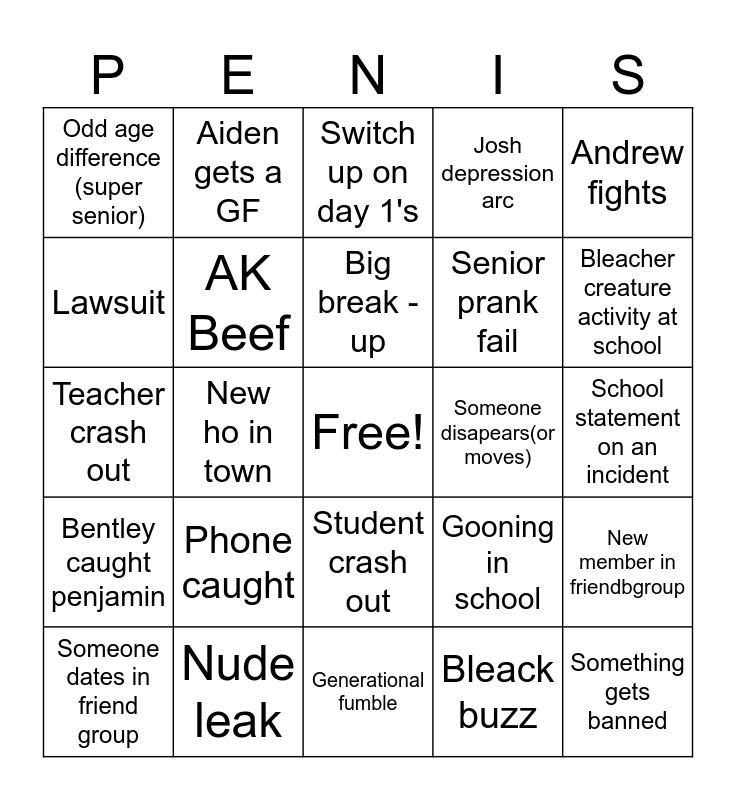 This bingo card has a free space and 34 words: Teacher charges, Bleack buzz, Teacher charged, Threat, Bentley caught penjamin, AK Beef, Andrew fights, Someone dates in friend group, Aiden gets a GF, "Glow up", Big break -up, Switch up on day 1's, Coming out, Transfer /exchange, Someone disapears(or moves), Bleacher creature activity at school, Nude leak, Teacher crash out, Phone caught, Gooning in school, Student crash out, Teacher pregnant, Odd age difference (super senior), School statement on an incident, Generational fumble, Something gets banned, Josh depression arc, Snow day, Senior prank fail, Lawsuit, HOCO game win, New ho in town, New member in friendbgroup and Teacher glazer.