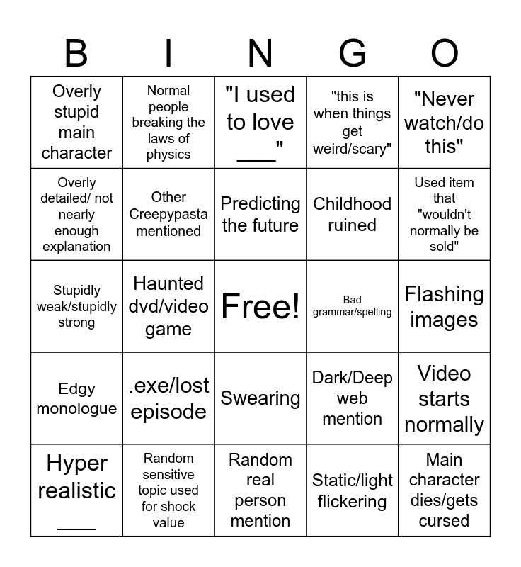 This bingo card has a free space and 29 words: Hyper realistic ___, Fictional Character Gore, Haunted dvd/video game, 666/'satanic', Overly stupid main character, "I used to love ___", Other Creepypasta mentioned, .exe/lost episode, Bad grammar/spelling, Random sensitive topic used for shock value, Flashing images, Main character dies/gets cursed, Random real person mention, Static/light flickering, Used item that "wouldn't normally be sold", Other media crossover, Swearing, Edgy monologue, "Never watch/do this", Stupidly weak/stupidly strong, Dark/Deep web mention, "It was all a dream. Or WAS it?"/ plot twist ending, Childhood ruined, Overly detailed/ not nearly enough explanation, "this is when things get weird/scary", Normal people breaking the laws of physics, Video starts normally, Predicting the future and Easily beatable monster.