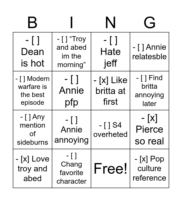 This bingo card has 17 words: Free!, - [x] Love troy and abed, - [ ] Hate jeff, - [ ] Dean is hot, - [ ] Annie annoying, - [ ] Annie relatesble, - [x] Pierce so real, - [x] Like britta at first, - [ ] Find britta annoying later, - [ ] Annie pfp, - [ ] Chang favorite character, - [ ] S4 overheted, - [ ] Modern warfare is the best episode, - [ ] “Troy and abed im the morning”, - [ ] Any mention of sideburns, - [ ] #SixSeasonsAndAMovie and - [x] Pop culture reference.