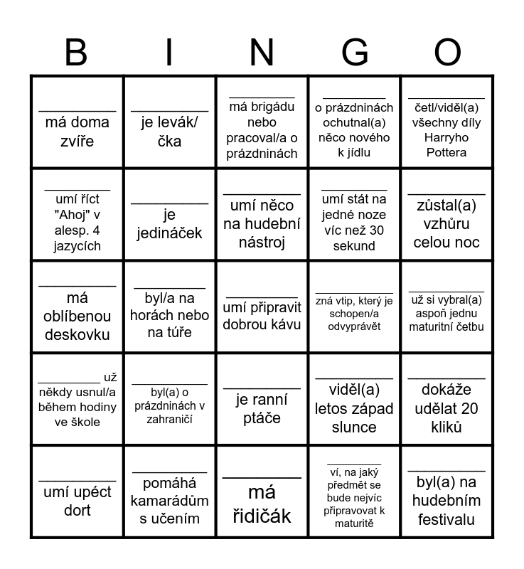 This bingo card has 25 words: ____________ byl(a) o prázdninách v zahraničí, _______ má řidičák, _________ umí něco na hudební nástroj, _________ umí upéct dort, ___________ četl/viděl(a) všechny díly Harryho Pottera, _________ má doma zvíře, _________ umí říct "Ahoj" v alesp. 4 jazycích, _________ je levák/čka, _____________ zná vtip, který je schopen/a odvyprávět, _________ je ranní ptáče, _________ umí stát na jedné noze víc než 30 sekund, _________ má oblíbenou deskovku, _________ viděl(a) letos západ slunce, _________ dokáže udělat 20 kliků, _________ je jedináček, _________ byl(a) na hudebním festivalu, ____________ už si vybral(a) aspoň jednu maturitní četbu, _________ má brigádu nebo pracoval/a o prázdninách, _________ zůstal(a) vzhůru celou noc, _________ byl/a na horách nebo na túře, _________ umí připravit dobrou kávu, _________ pomáhá kamarádům s učením, _________ už někdy usnul/a během hodiny ve škole, _________ o prázdninách ochutnal(a) něco nového k jídlu and _________ ví, na jaký předmět se bude nejvíc připravovat k maturitě.