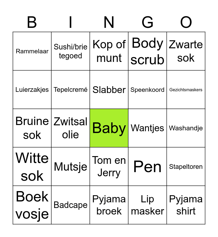 This bingo card has a free space and 29 words: Boek vosje, Fruitspeen, Zwitsal olie, Baby on board, Rammelaar, Kop of munt, Tepelcremé, Mutsje, Wantjes, Badcape, Washandje, Pyjama shirt, Pyjama broek, Lip masker, Gezichtsmaskers, Buikmasker, Tom en Jerry, Witte sok, Zwarte sok, Bruine sok, Pen, Luiertas hanger, Speenkoord, Luierzakjes, Body scrub, Sushi/brie tegoed, Stapeltoren, Slabber and Nijntje hoes.