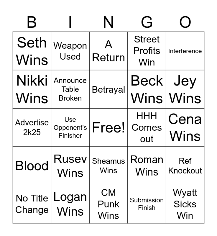 This bingo card has a free space and 32 words: Submission Finish, Super Finisher, Use Opponent’s Finisher, Injury, Blood, Announce Table Broken, Interference, Ref Knockout, Weapon Used, DQ, Betrayal, A Return, Announce Attendance Numbers, Crowd Chants This Is Awesome, HHH Comes out, Title Change, No Title Change, Advertise 2k25, Sheamus Wins, Rusev Wins, Roman Wins, Bronson Wins, Cena Wins, Logan Wins, Wyatt Sicks Win, Street Profits Win, Beck Wins, Nikki Wins, Seth Wins, CM Punk Wins, LA Knight Wins and Jey Wins.