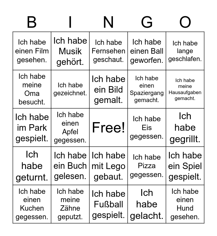 This bingo card has a free space and 25 words: Ich habe ein Buch gelesen., Ich habe Fußball gespielt., Ich habe ein Bild gemalt., Ich habe einen Kuchen gegessen., Ich habe lange geschlafen., Ich habe einen Film gesehen., Ich habe meine Oma besucht., Ich habe Musik gehört., Ich habe Eis gegessen., Ich habe mit Lego gebaut., Ich habe einen Spaziergang gemacht., Ich habe im Park gespielt., Ich habe Pizza gegessen., Ich habe ein Spiel gespielt., Ich habe gezeichnet., Ich habe meine Freunde getroffen., Ich habe gegrillt., Ich habe Fernsehen geschaut., Ich habe meine Hausaufgaben gemacht., Ich habe einen Apfel gegessen., Ich habe einen Hund gesehen., Ich habe meine Zähne geputzt., Ich habe geturnt., Ich habe einen Ball geworfen. and Ich habe gelacht..