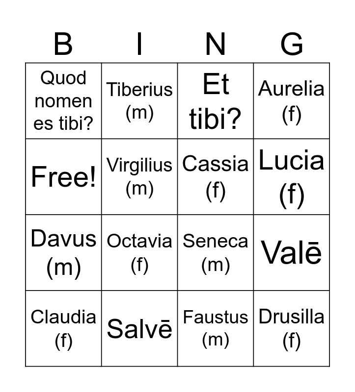 This bingo card has 16 words: Salvē, Valē, Et tibi?, Quod nomen es tibi?, Davus (m), Tiberius (m), Seneca (m), Faustus (m), Free!, Virgilius (m), Claudia (f), Aurelia (f), Octavia (f), Lucia (f), Cassia (f) and Drusilla (f).