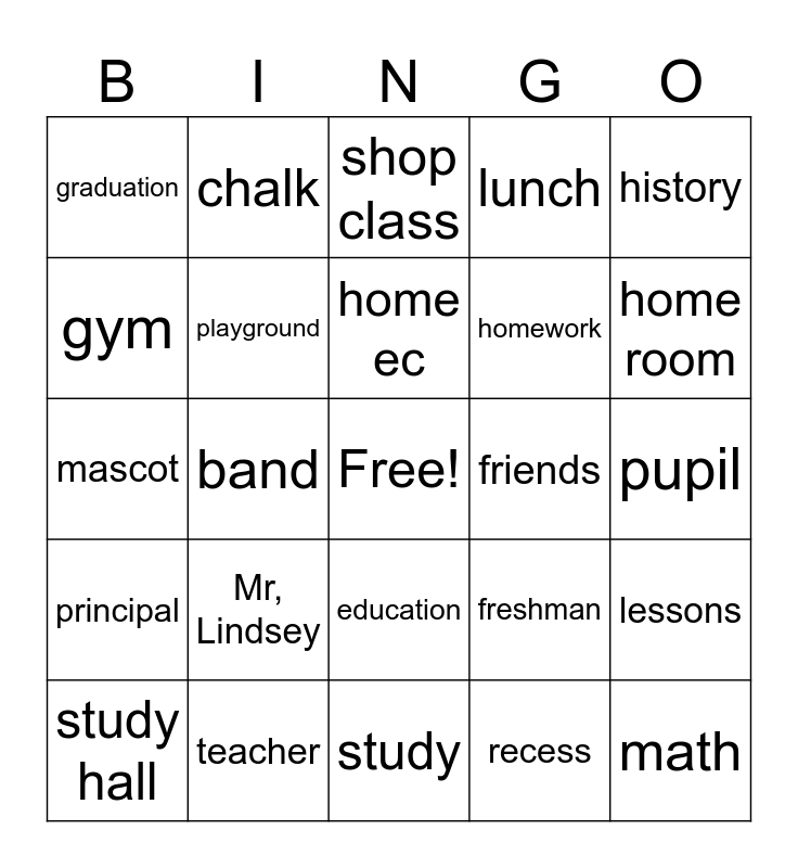 This bingo card has a free space and 59 words: classroom, teacher, bus, principal, recess, books, playground, hollidaysburg, homework, desk, lunch, library, gym, student, prom, graduation, math, history, reading, home ec, friends, shop class, study hall, lessons, test, rules, blackboard, report card, home room, tiger, note book, blue & white, book covers, erasers, chalk, learning, grades, band, football, mascot, 1968, Mr, Lindsey, pupil, bell, pencil, lunch box, reunions, globe, education, study, diploma, classmate, senior, cafeteria, junior, freshman, sophmore, yearbook and field trip.