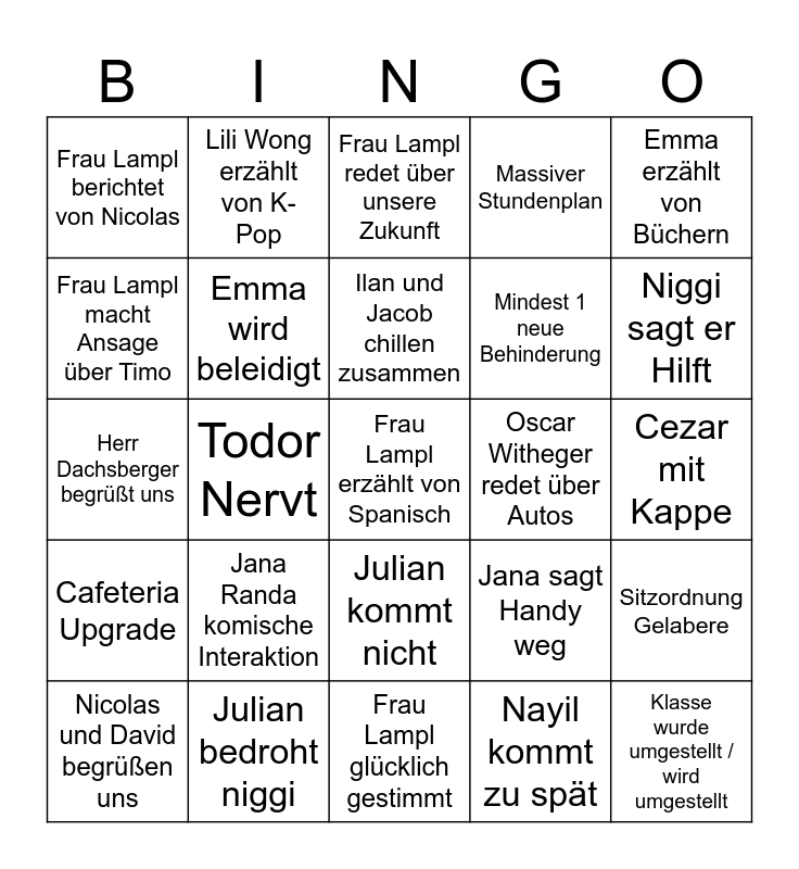 This bingo card has a free space and 24 words: Jana Randa komische Interaktion, Julian bedroht niggi, Ilan und Jacob chillen zusammen, Nicolas und David begrüßen uns, Emma erzählt von Büchern, Frau Lampl berichtet von Nicolas, Frau Lampl macht Ansage über Timo, Lili Wong erzählt von K-Pop, Oscar Witheger redet über Autos, Julian kommt nicht, Mindest 1 neue Behinderung, Herr Dachsberger begrüßt uns, Jana sagt Handy weg, Sitzordnung Gelabere, Emma wird beleidigt, Nayil kommt zu spät, Cezar mit Kappe, Frau Lampl redet über unsere Zukunft, Niggi sagt er Hilft, Todor Nervt, Klasse wurde umgestellt / wird umgestellt, Cafeteria Upgrade, Massiver Stundenplan and Frau Lampl glücklich gestimmt.