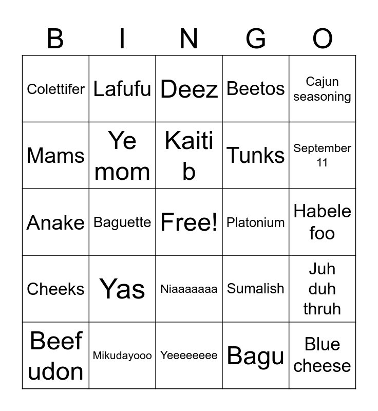 This bingo card has a free space and 24 words: Yas, Mikudayooo, Kaiti b, Beef udon, Cajun seasoning, Colettifer, Mams, Lafufu, Platonium, Niaaaaaaa, Tunks, Anake, Sumalish, Juh duh thruh, Ye mom, Bagu, Habele foo, Deez, September 11, Baguette, Blue cheese, Cheeks, Beetos and Yeeeeeeee.