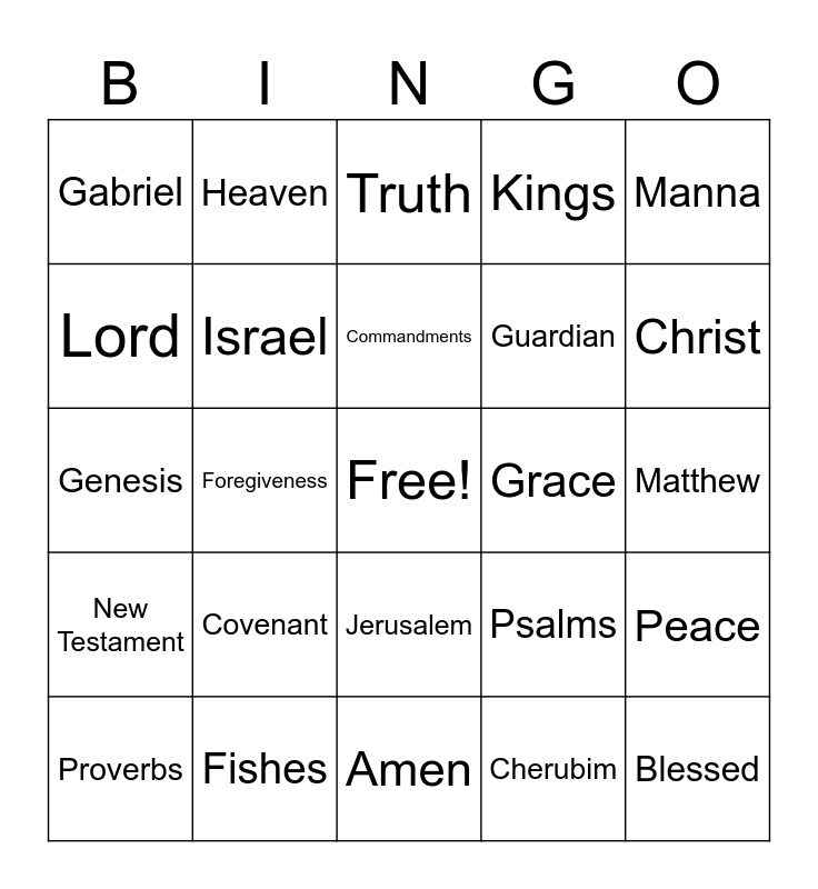 This bingo card has a free space and 50 words: Shepherd, Blessed, Saints, Amen, Covenant, Faithfulness, Heaven, Holy, Lord, Parable, Israel, Kings, Peace, Psalms, Temple, Angels, Commandments, Grace, Egypt, Manna, Foregiveness, Cherubim, Gabriel, Guardian, Seraphim, Bread, Christ, Faith, Truth, Jerusalem, God, John, Kingdom, Jonah, Fishes, Mark, Noah, Moses, Ark, Matthew, Luke, Creation, Resurrection, Christmas, Proverbs, Genesis, Revelation, Old Testament, New Testament and Church.