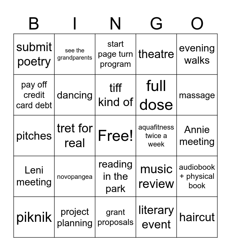 This bingo card has a free space and 24 words: novopangea, project planning, tiff kind of, piknik, evening walks, submit poetry, pay off credit card debt, see the grandparents, aquafitness twice a week, reading in the park, full dose, pitches, music review, audiobook + physical book, dancing, literary event, Annie meeting, start page turn program, massage, tret for real, haircut, Leni meeting, theatre and grant proposals.