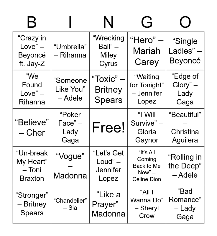 This bingo card has a free space and 25 words: “Vogue” – Madonna, “Like a Prayer” – Madonna, “Toxic” – Britney Spears, “Stronger” – Britney Spears, “Single Ladies” – Beyoncé, “Crazy in Love” – Beyoncé ft. Jay-Z, “We Found Love” – Rihanna, “Umbrella” – Rihanna, “I Will Survive” – Gloria Gaynor, “Let’s Get Loud” – Jennifer Lopez, “Waiting for Tonight” – Jennifer Lopez, “Believe” – Cher, “It’s All Coming Back to Me Now” – Celine Dion, “Rolling in the Deep” – Adele, “Someone Like You” – Adele, “Genie in a Bottle” – Christina Aguilera, “Beautiful” – Christina Aguilera, “Wrecking Ball” – Miley Cyrus, “Edge of Glory” – Lady Gaga, “Poker Face” – Lady Gaga, “Bad Romance” – Lady Gaga, “Chandelier” – Sia, “Un-break My Heart” – Toni Braxton, “Hero” – Mariah Carey and “All I Wanna Do” – Sheryl Crow.