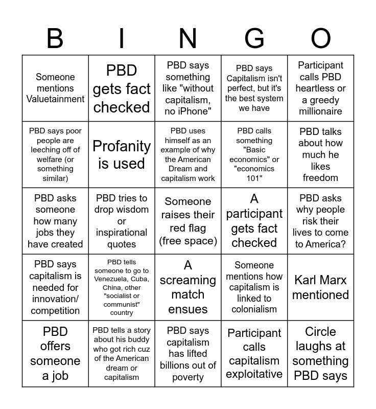 This bingo card has a free space and 24 words: PBD tells someone to go to Venezuela, Cuba, China, other "socialist or communist" country, PBD tells a story about his buddy who got rich cuz of the American dream or capitalism, PBD uses himself as an example of why the American Dream and capitalism work, PBD offers someone a job, Participant calls PBD heartless or a greedy millionaire, Someone mentions Valuetainment, PBD says poor people are leeching off of welfare (or something similar), PBD gets fact checked, A participant gets fact checked, A screaming match ensues, PBD calls something "Basic economics" or "economics 101", PBD asks someone how many jobs they have created, Someone mentions how capitalism is linked to colonialism, Karl Marx mentioned, Profanity is used, Participant calls capitalism exploitative, PBD asks why people risk their lives to come to America?, PBD says something like "without capitalism, no iPhone", PBD talks about how much he likes freedom, PBD tries to drop wisdom or inspirational quotes, Circle laughs at something PBD says, PBD says capitalism is needed for innovation/ competition, PBD says Capitalism isn't perfect, but it's the best system we have and PBD says capitalism has lifted billions out of poverty.