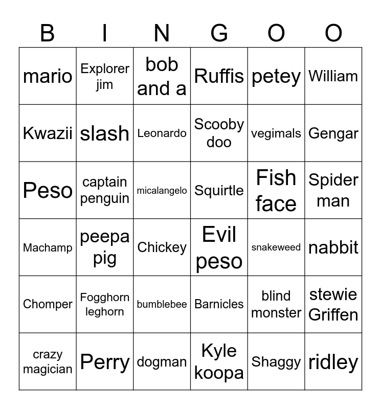 This bingo card has 36 words: Barnicles, bumblebee, Kyle koopa, Kwazii, Machamp, Squirtle, slash, dogman, petey, blind monster, Gengar, Ruffis, stewie Griffen, captain penguin, Scooby doo, mario, Chomper, Fish face, Peso, bob and a, micalangelo, peepa pig, Evil peso, Chickey, snakeweed, Explorer jim, vegimals, Perry, Leonardo, William, ridley, crazy magician, nabbit, Spider man, Fogghorn leghorn and Shaggy.