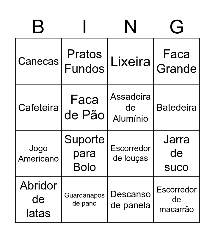 This bingo card has 50 words: Tupperware, Abridor de latas, Espátula de silicone, Porta-temperos, Açucareiro, Espremedor de frutas, Pratos Fundos, socador de alho, Faca de Pão, Pratos Rasos, Assadeira de Alumínio, Faca Grande, Ralador, Avental, Frigideira, tigela, Batedeira, Guardanapos de pano, Saleiro, Cafeteira, Jarra de suco, Sanduicheira, Canecas, Jogo Americano, Chaleira elétrica, Liquidificador, Suporte para Bolo, Concha, Lixeira, Tábua de corte, Conjunto de potes, Luva Térmica, Talheres, Copos, Medidor de alimentos, Tapete, Cortador de pizza, Panela, Tigelas de sobremesa, Descanso de panela, Pano de prato, Toalha de mesa, Descascador, Pegador de macarrão, Travessa, Escorredor de louças, Peneira, Xícaras, Escorredor de macarrão and Petisqueira.