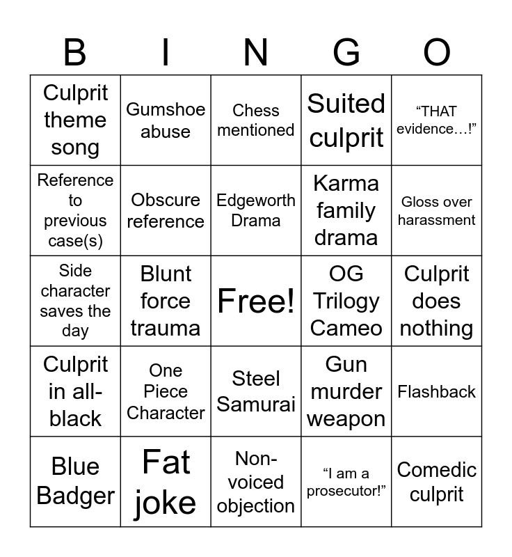 This bingo card has a free space and 24 words: One Piece Character, Fat joke, Edgeworth Drama, Blue Badger, “THAT evidence…!”, Culprit theme song, Reference to previous case(s), Gumshoe abuse, OG Trilogy Cameo, Steel Samurai, Karma family drama, Side character saves the day, Gun murder weapon, Flashback, Obscure reference, “I am a prosecutor!”, Culprit does nothing, Chess mentioned, Gloss over harassment, Blunt force trauma, Comedic culprit, Culprit in all-black, Suited culprit and Non-voiced objection.
