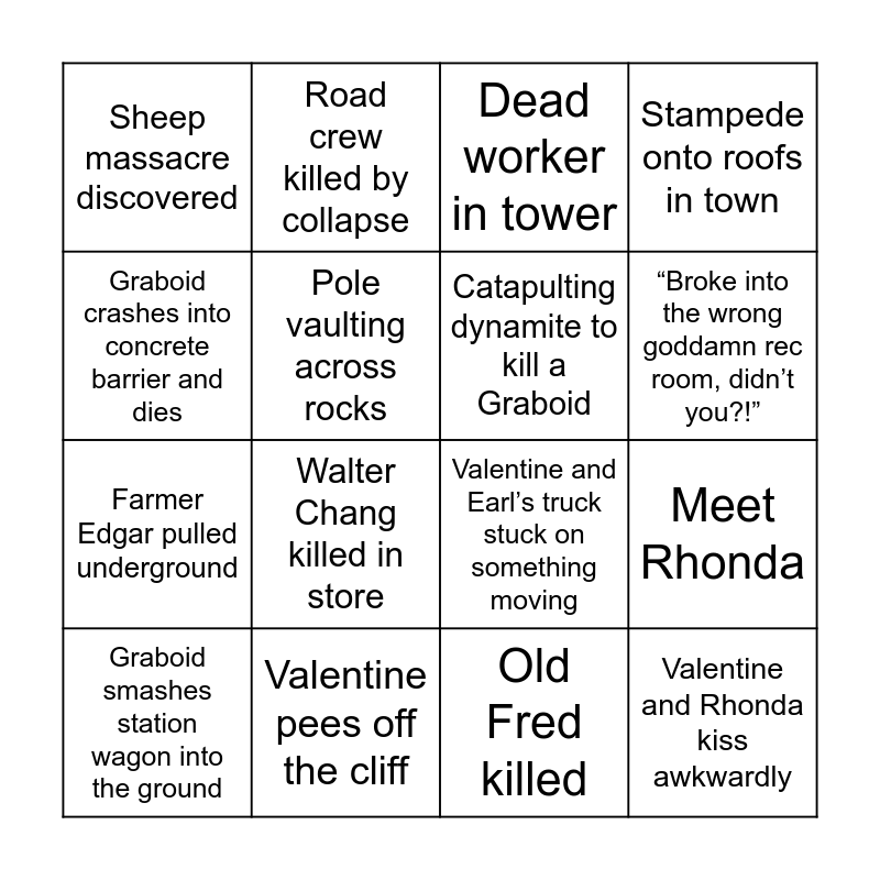 This bingo card has 16 words: Valentine pees off the cliff, Meet Rhonda, Dead worker in tower, Sheep massacre discovered, Farmer Edgar pulled underground, Road crew killed by collapse, Valentine and Earl’s truck stuck on something moving, Old Fred killed, Graboid crashes into concrete barrier and dies, Pole vaulting across rocks, Graboid smashes station wagon into the ground, Stampede onto roofs in town, Walter Chang killed in store, “Broke into the wrong goddamn rec room, didn’t you?!”, Catapulting dynamite to kill a Graboid and Valentine and Rhonda kiss awkwardly.