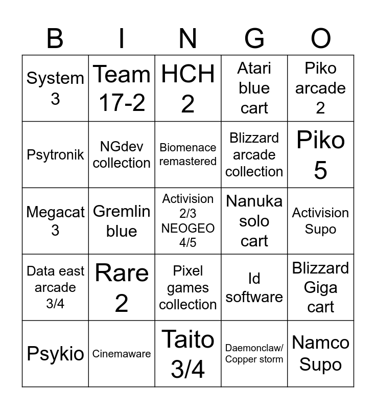 This bingo card has a free space and 24 words: Rare 2, Cinemaware, Biomenace remastered, Psykio, Piko arcade 2, System 3, Psytronik, Team 17-2, Nanuka solo cart, Pixel games collection, Blizzard arcade collection, Megacat 3, Id software, Blizzard Giga cart, NGdev collection, Daemonclaw/ Copper storm, Activision Supo, HCH 2, Piko 5, Gremlin blue, Namco Supo, Data east arcade 3/4, Atari blue cart and Taito 3/4.