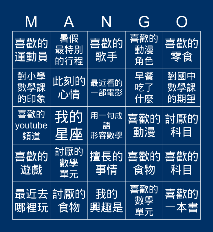 This bingo card has 25 words: 討厭的 數學 單元, 我的 興趣是, 最近看的 一部電影, 最近去哪裡玩, 喜歡的零食, 喜歡的運動員, 對小學 數學課 的印象, 暑假 最特別 的行程, 喜歡的動漫, 擅長的事情, 早餐 吃了 什麼, 喜歡的youtube頻道, 喜歡的食物, 喜歡的科目, 此刻的心情, 喜歡的一本書, 討厭的科目, 喜歡的歌手, 對國中 數學課 的期望, 我的星座, 用一句成語 形容數學, 討厭的食物, 喜歡的遊戲, 喜歡的 動漫 角色 and 喜歡的 數學 單元.