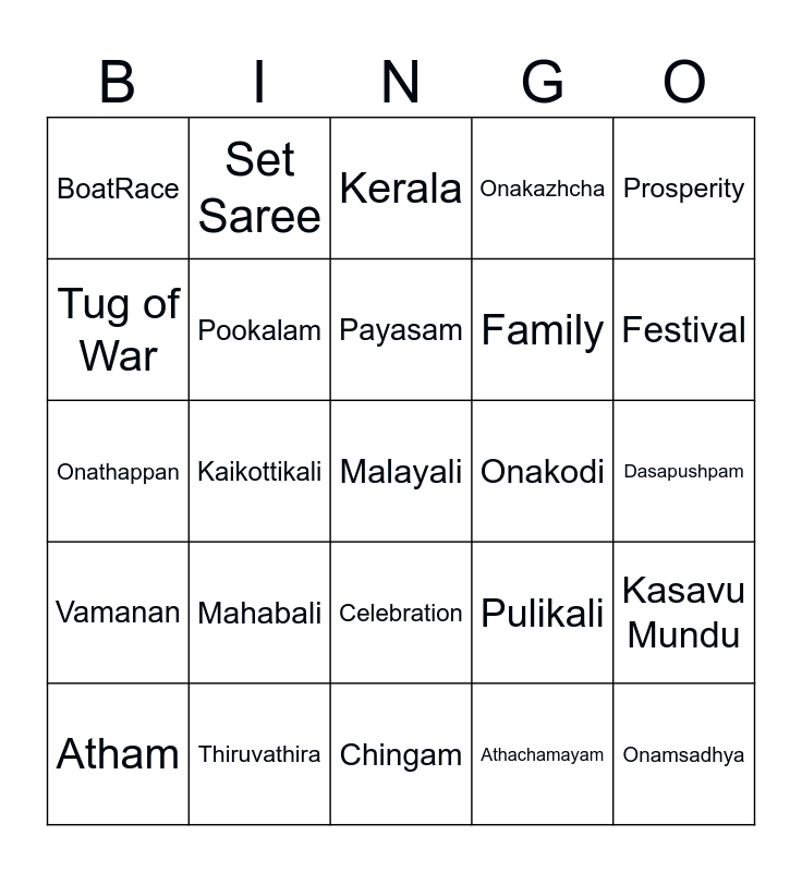 This bingo card has a free space and 29 words: Atham, Thumbapoo, Kaikottikali, Harvest, BoatRace, Kerala, Pookalam, Mahabali, Onakodi, Thiruvathira, Dasapushpam, Onamsadhya, Chingam, Athachamayam, Festival, Thiruvonam, Celebration, Vamanan, Prosperity, Onathappan, Pulikali, LordVishnu, Family, Tug of War, Onakazhcha, Set Saree, Kasavu Mundu, Payasam and Happy Onam.